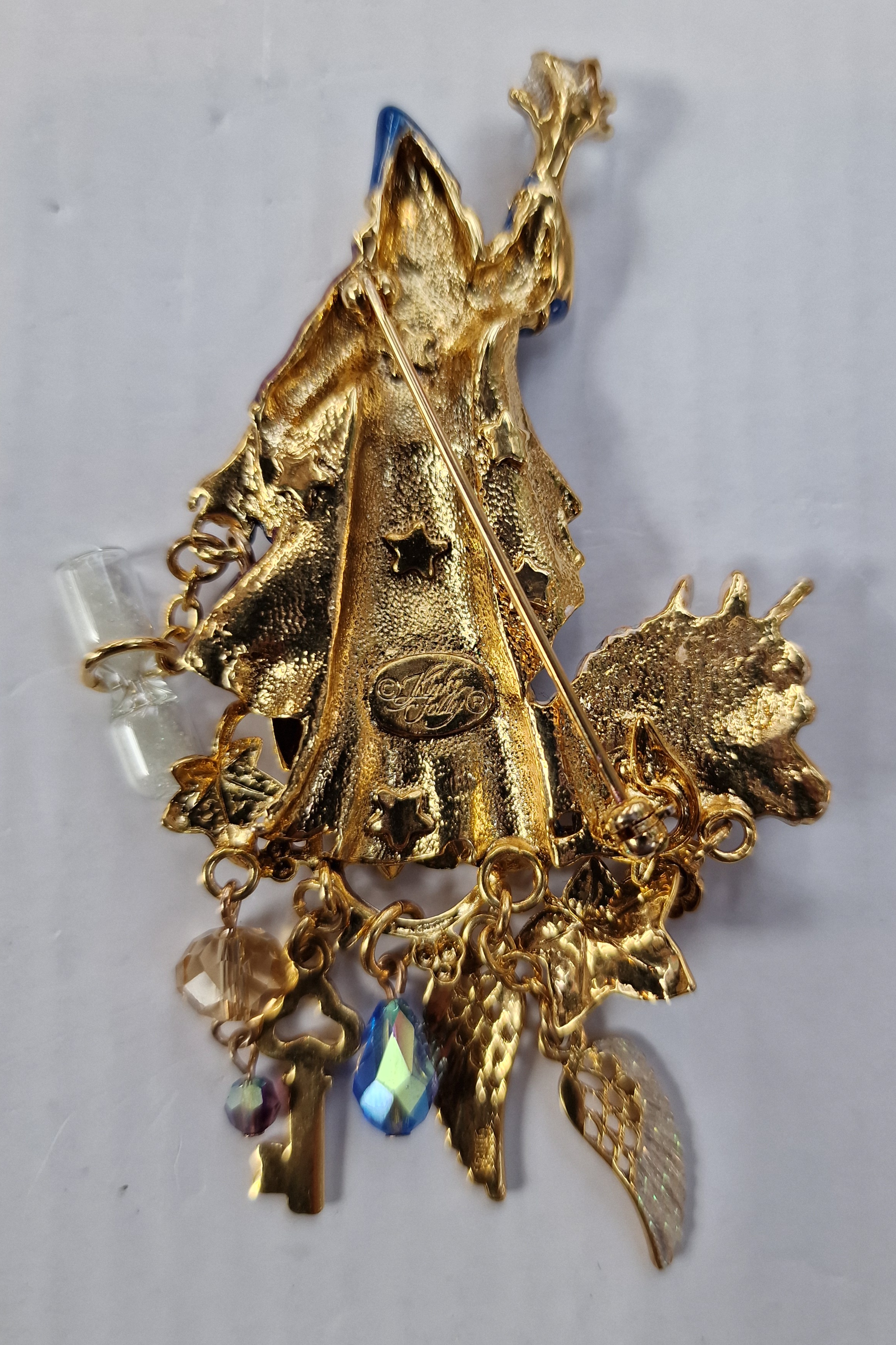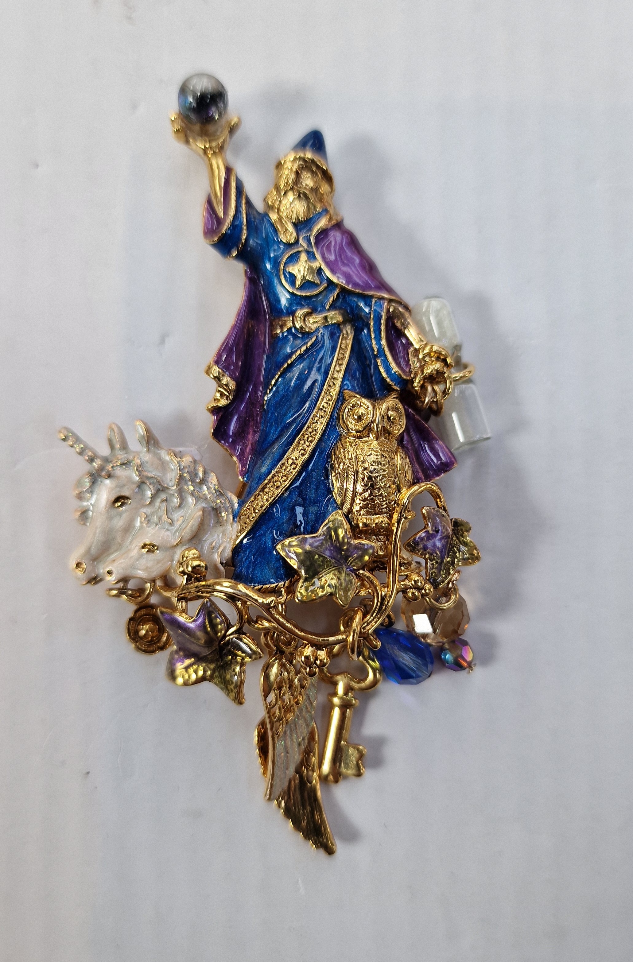 The brooch also features a unicorn and an owl and it has dangling charms like winglets, keys and beads. .